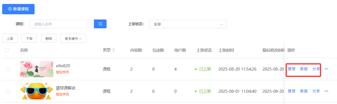 本课程平台提供了全面的课程管理功能,包括课程列表页的展示与操作,以及新建课程、上下架、编辑管理课程等操作,方便您对课程进行全方位的管理和维护。