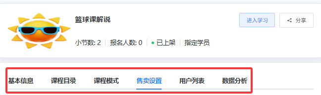 在【课程管理页】,可对基本信息、课程目录、课程模式、售卖设置、用户列表、数据信息进行管理查看