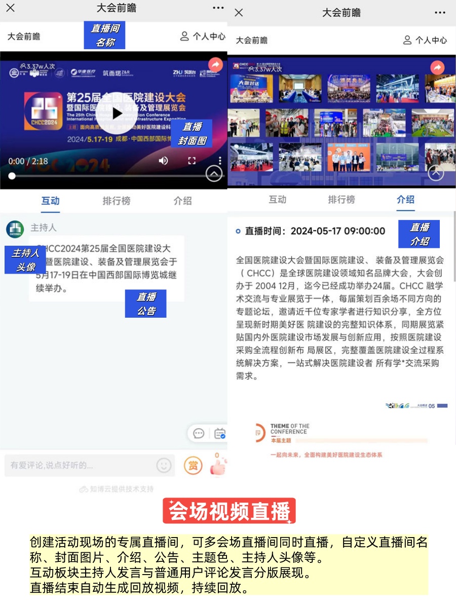 创建活动现场的专属直播间,可多会场直播间同时直播,自定义直播间名称、封面图片、介绍、公告、主题色、主持人头像等。互动板块主持人发言与普通用户评论发言分版展现。直播结束自动生成回放视频,持续回放。